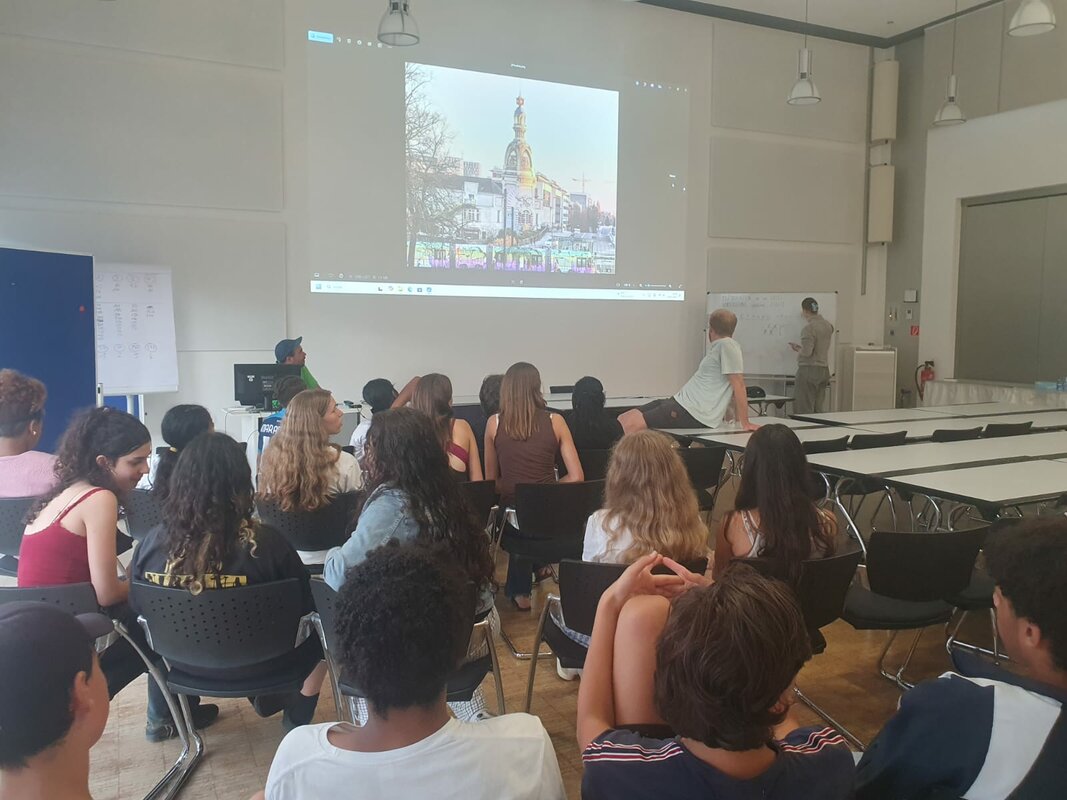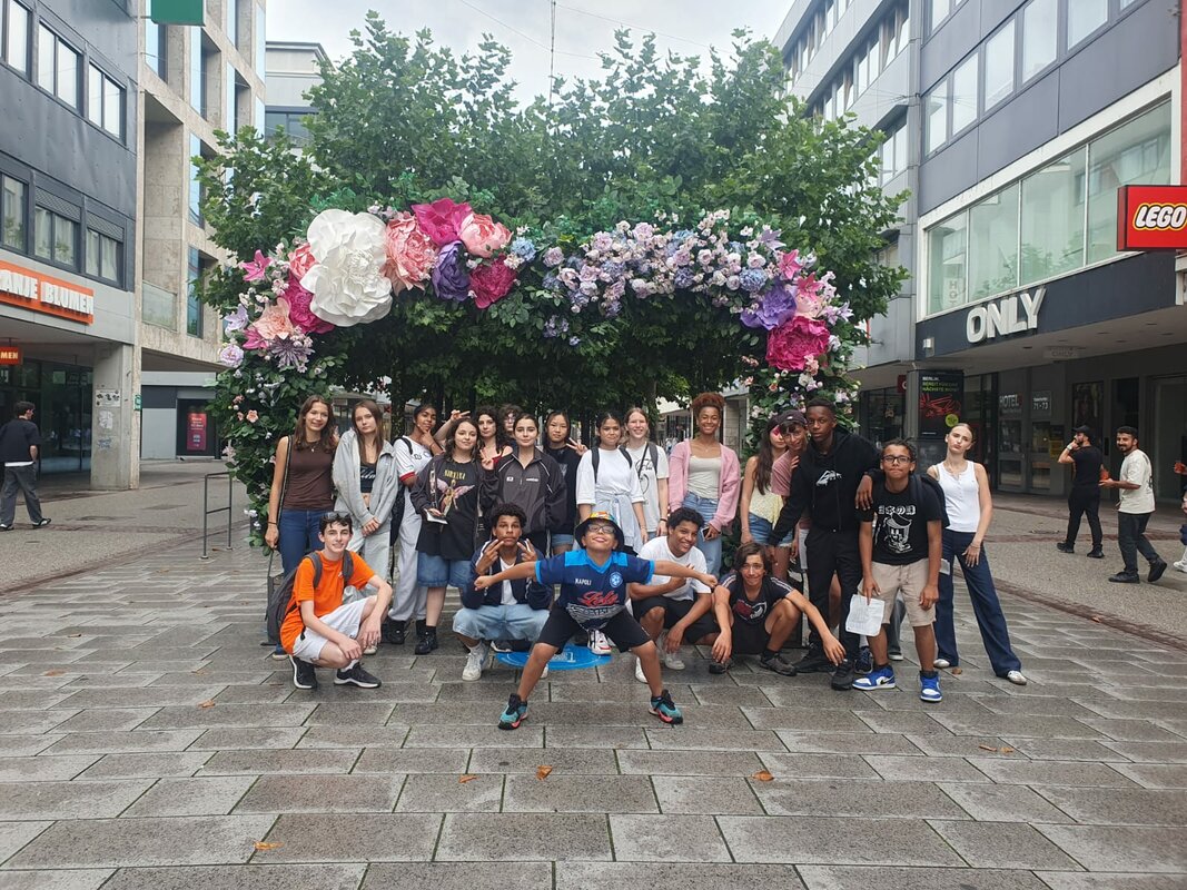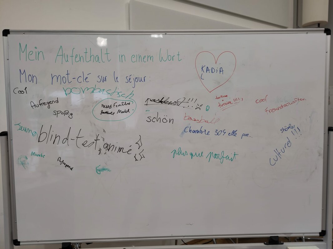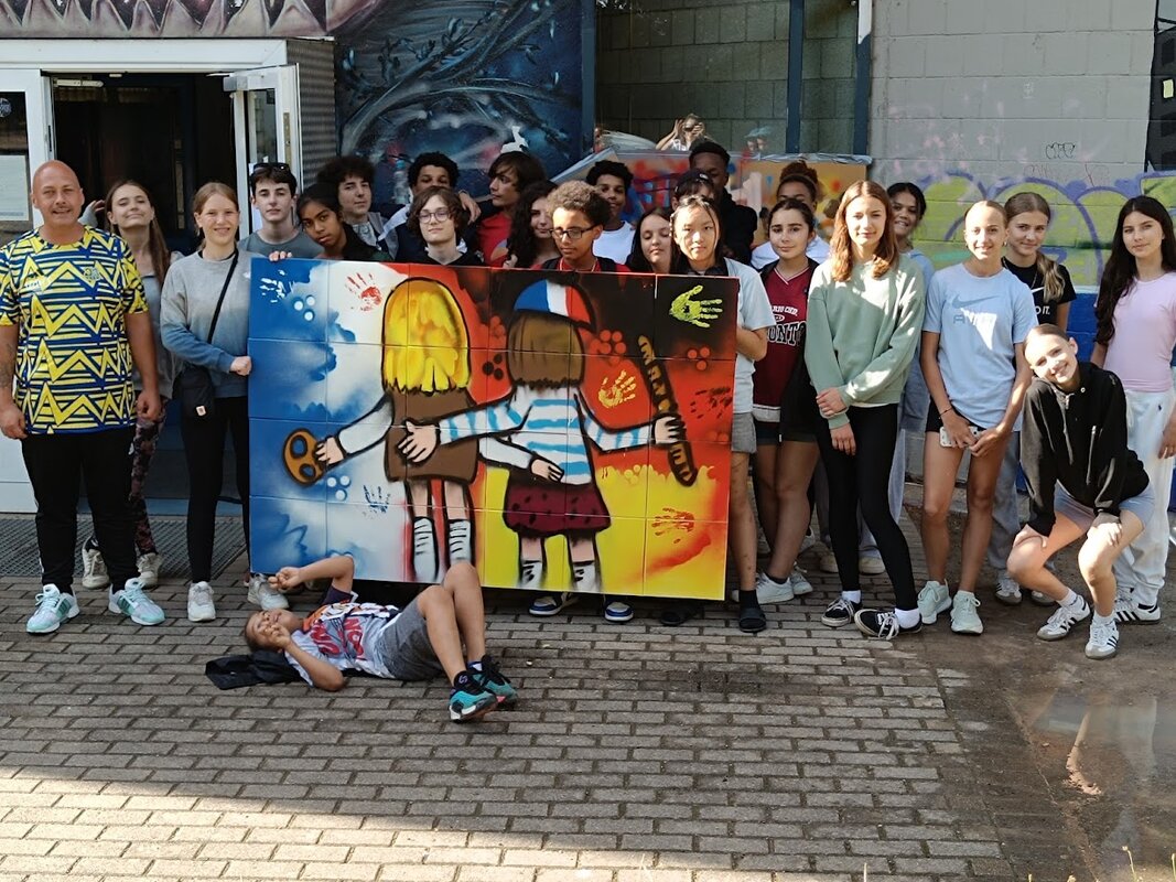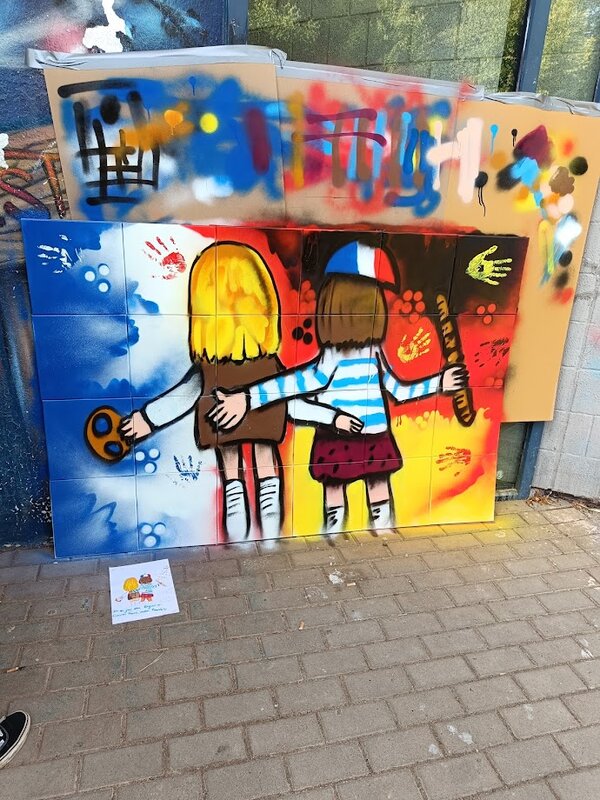Ein Highlight der Woche war der Graffiti-Workshop im Jugendzentrum Folsterhöhe. Unter dem Motto „deutsch-französische Freundschaft“ entwarfen die Jugendlichen zunächst eigene Skizzen, bevor sie gemeinsam ein großes Bild erschufen: Jede*r gestaltete eine einzelne Leinwand, die später zu einem Gesamtwerk zusammengesetzt wurden. Die Botschaft: Das Bild ist erst vollständig, wenn wir alle wieder zusammenkommen.