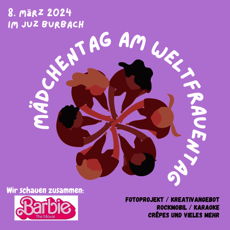 Das Jugendzentrum Burbach feiert den Weltfrauentag und lädt alle Mädchen zum Mädchentag ein. Wir schauen zusammen "Barbie - The Movie", fotografieren, basteln, machen Musik und singen. Leckeres Essen gibt es selbstverständlich auch.
